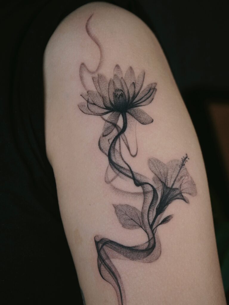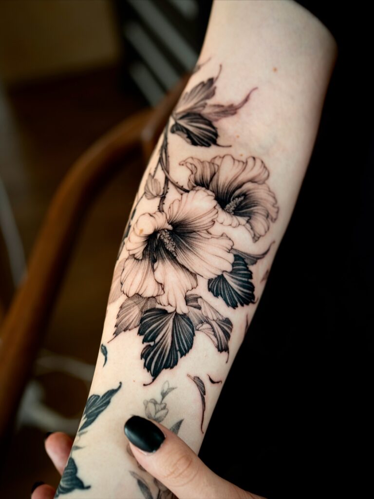 This black and grey hibiscus tattoo features elongated stems and flowing lines that create movement across the arm. Dotwork shading adds texture while keeping the overall look soft and organic rather than heavy.