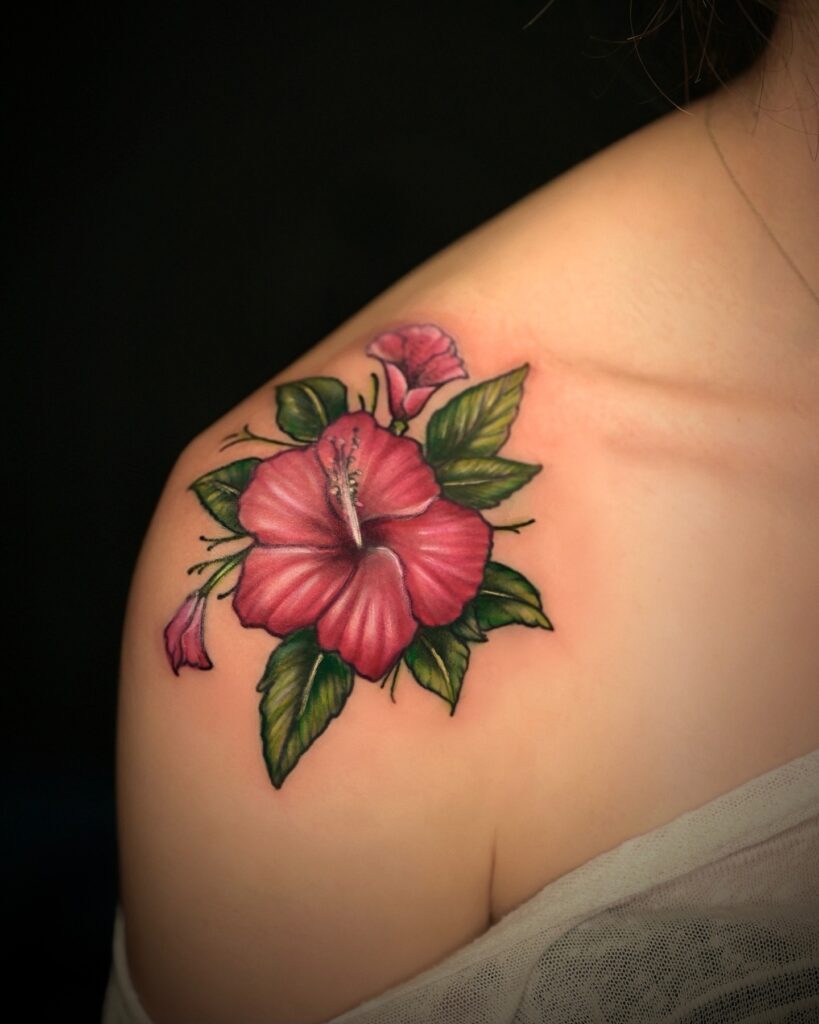 This shoulder tattoo features a richly colored red hibiscus with lush green leaves, rendered in a realistic style. The smooth color transitions and crisp outlines give the flower a fresh, lively appearance that sits beautifully on the curve of the shoulder, enhancing its natural shape.
