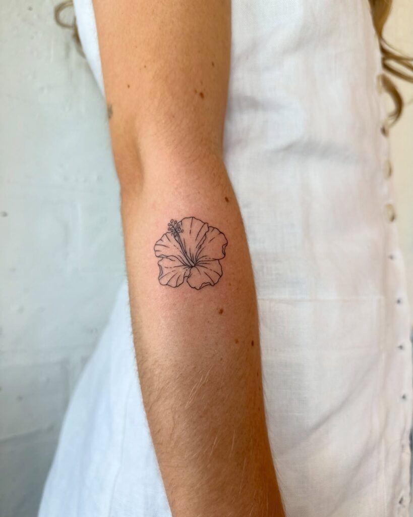 This forearm tattoo showcases a single hibiscus drawn in clean, minimal linework. The lack of shading emphasizes the natural shape of the petals and keeps the design modern and refined.