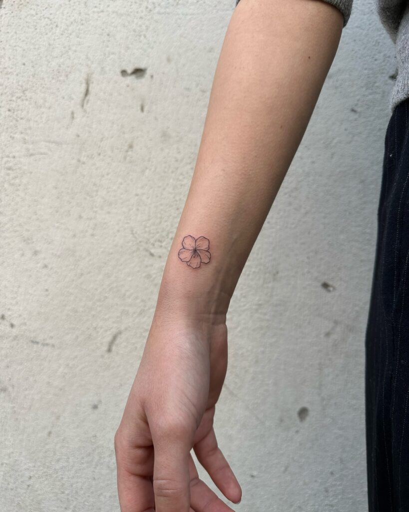 4. Tiny Fine-Line Hibiscus Wrist Tattoo