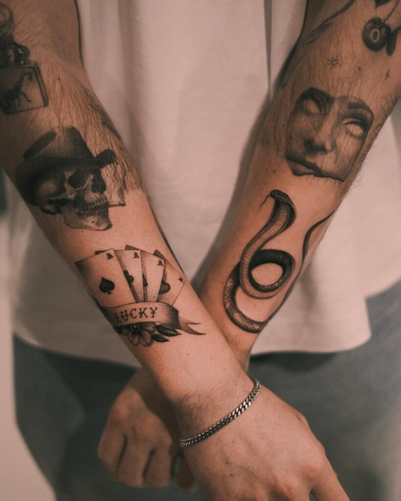This forearm features classic tattoo motifs like skulls, cards, snakes, and banners, all rendered in a traditional-inspired patchwork style. The bold shading and recognizable imagery give it a timeless tattoo-shop feel.