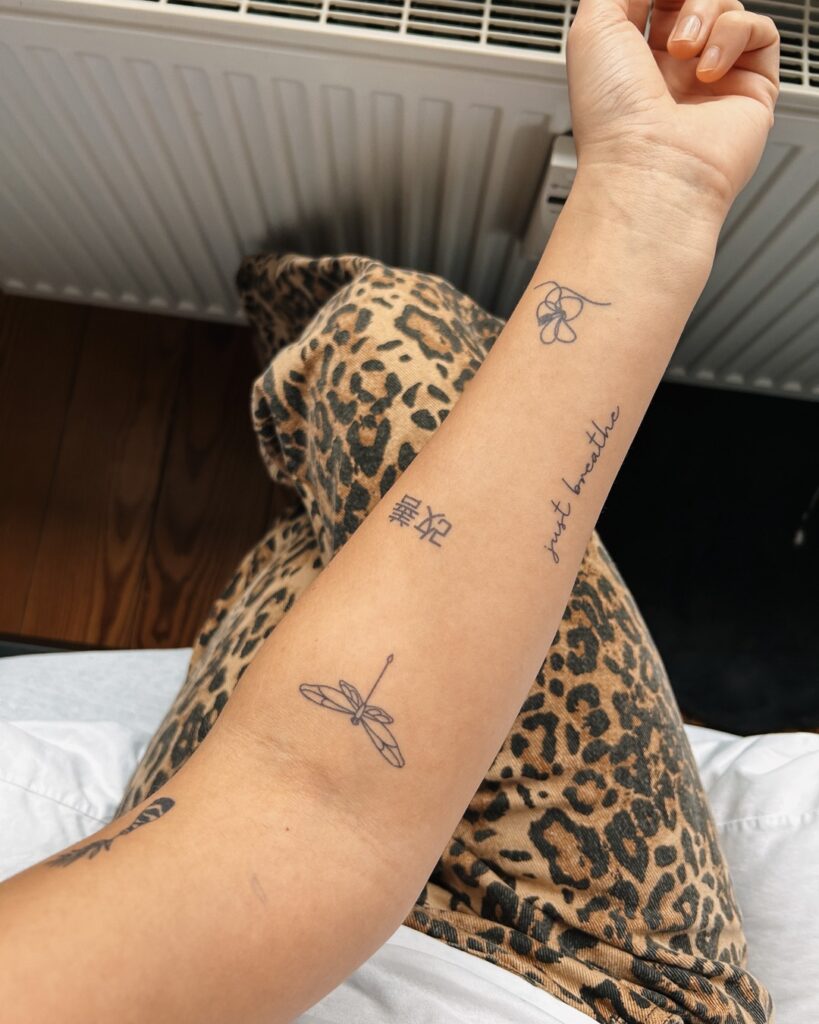 This forearm showcases a delicate patchwork of fine-line tattoos, including symbols, text, and small illustrative elements. Each design stands alone yet contributes to a cohesive, personal story. The spacing gives the tattoos room to breathe, creating a curated, intentional look.