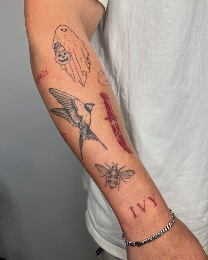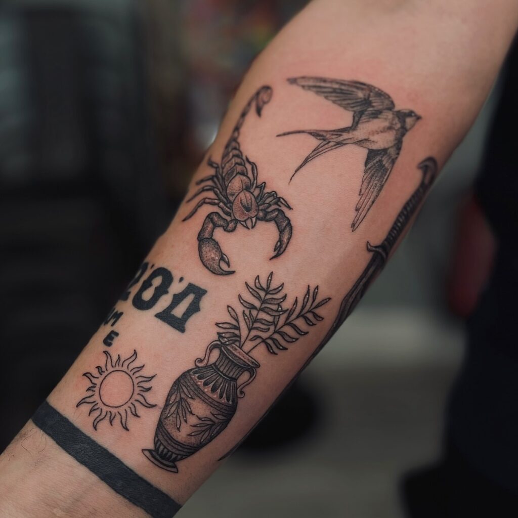 When planning a patchwork tattoo, think collection, not perfection. Each tattoo should stand strong on its own while still feeling cohesive overall. You can stick to a theme (like florals, symbols, or nostalgia) or mix styles intentionally. Black ink and bold lines age especially well, but fine-line pieces can work too. Placement matters—arms, legs, and thighs are the most popular areas because they offer room to grow your patchwork over time.