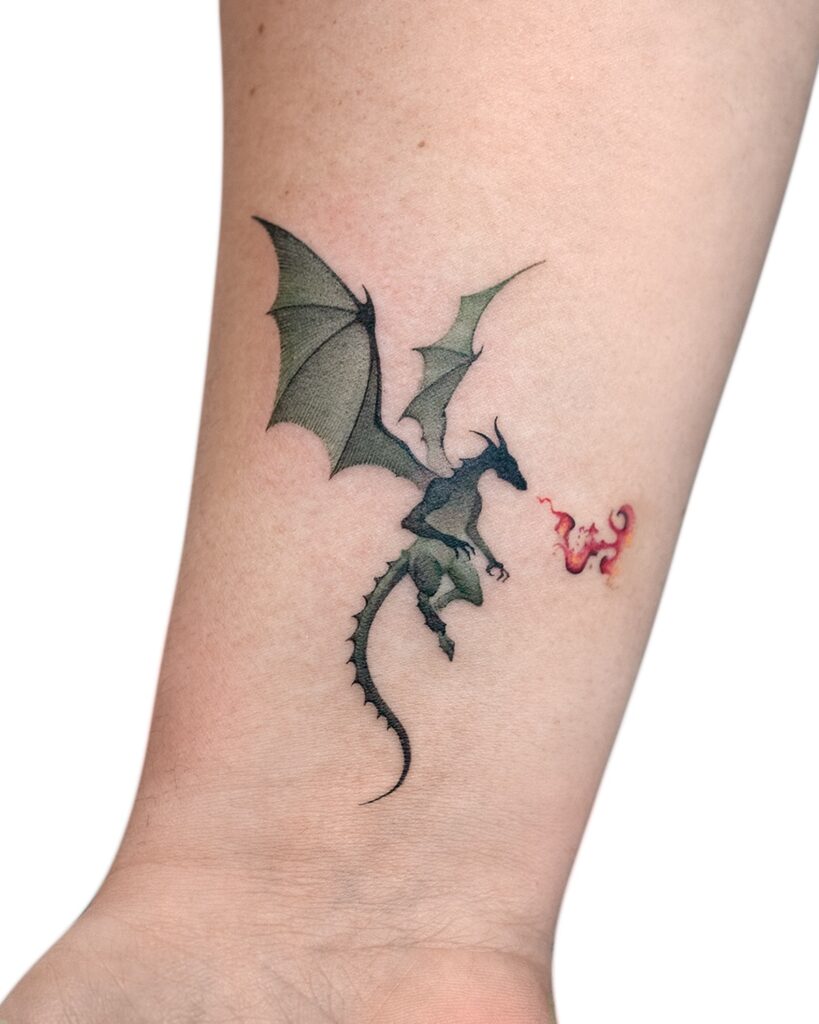 This small yet detailed tattoo portrays a winged green dragon exhaling a burst of fiery red flames. Despite its compact size, the shading on the wings and body gives it remarkable depth and character.