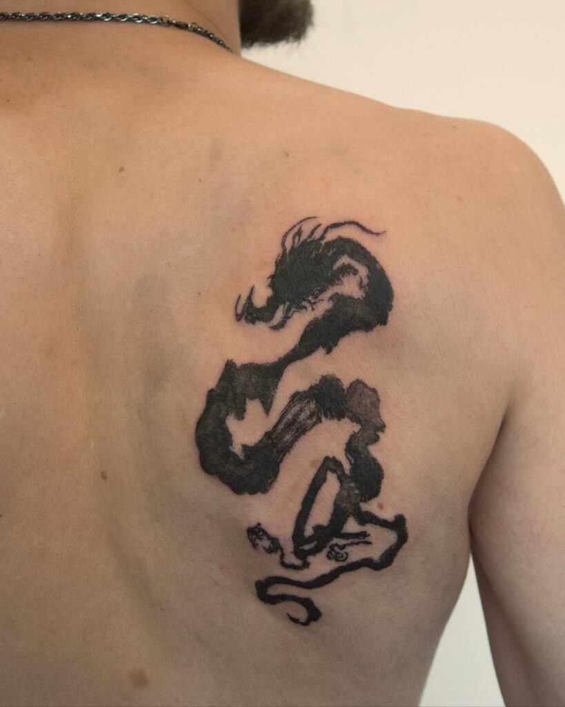 This unique dragon tattoo appears almost like an ink painting brushed directly onto the skin. Its abstract, flowing form uses bold black strokes to capture movement and energy rather than fine detail. Positioned on the upper back, it gives the impression of a traditional East Asian ink wash painting, symbolizing strength, flow, and balance.