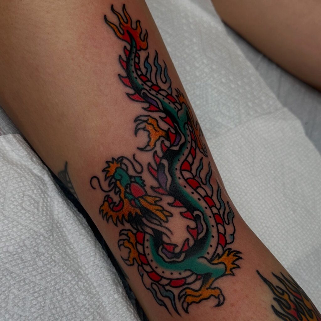 This colorful dragon tattoo bursts with energy through bold shades of green, red, and orange. Its long, coiling body is wrapped in flames, symbolizing strength, rebirth, and unstoppable power.