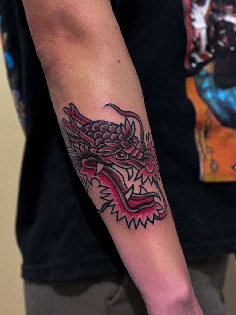 This forearm tattoo displays a bold dragon head in traditional tattoo style, with thick outlines, vibrant red accents, and exaggerated features. The dragon’s fierce eyes and flowing whiskers convey strength and energy, while the sharp teeth and coiled tongue add intensity.
