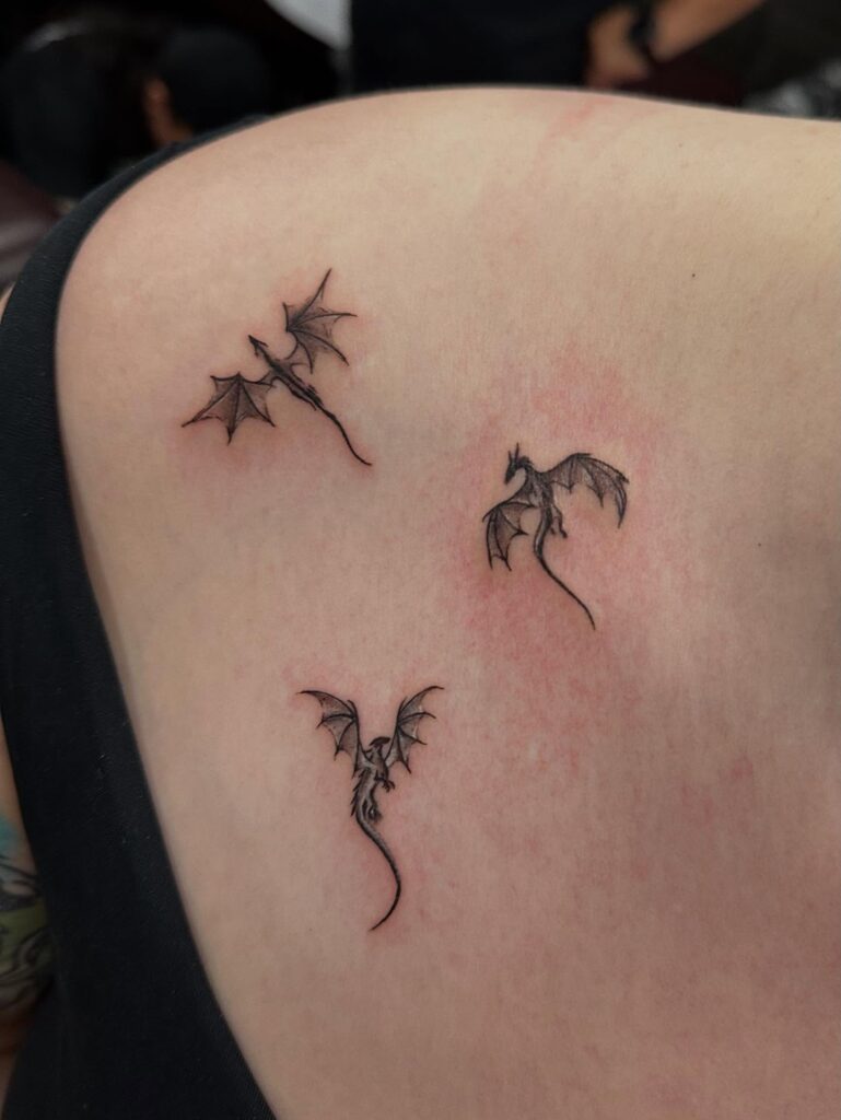 This tattoo features three delicate dragons on the shoulder blade, each depicted in minimalist fine linework. The small designs are carefully spaced to create a sense of movement, as though the dragons are gliding across the back.