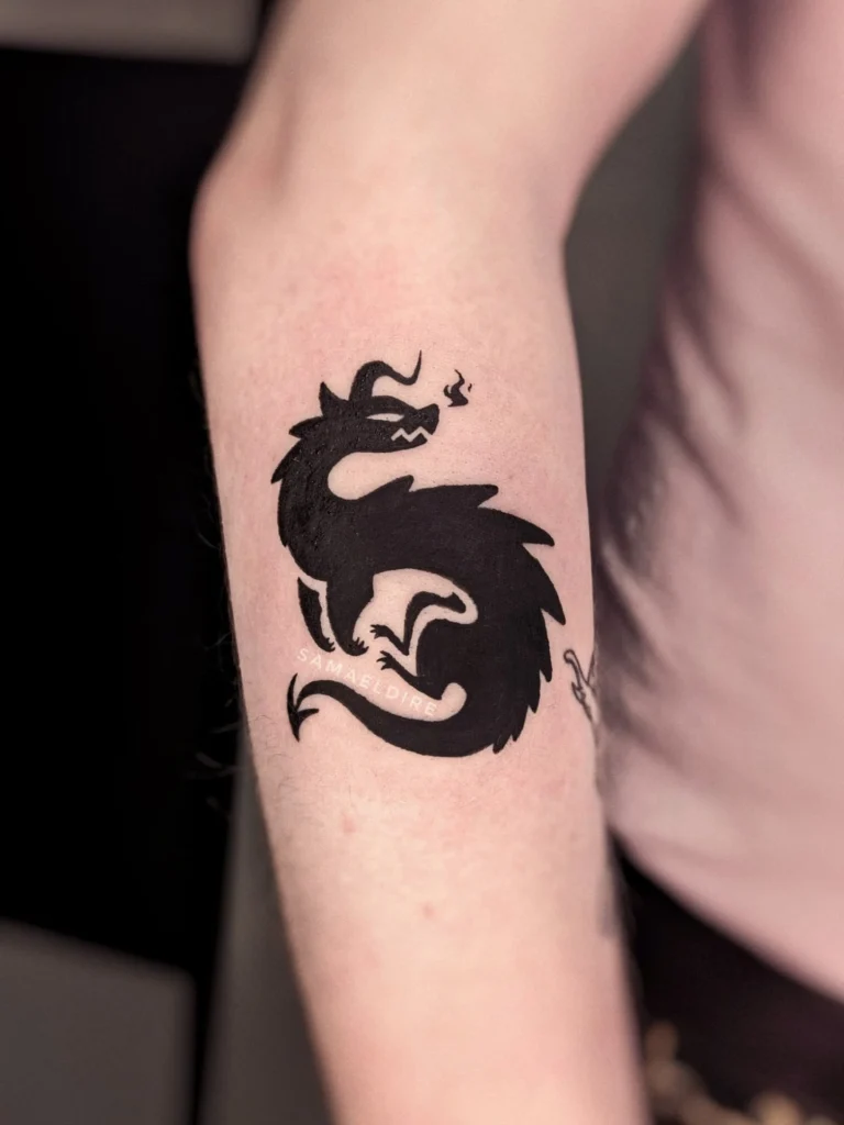 Placed on the inner arm, the tattoo’s solid black ink gives it a striking, graphic quality that stands out without overwhelming detail. This design is ideal for those who love the idea of dragons but prefer clean, contemporary artwork over intricate linework, making it both edgy and elegant.