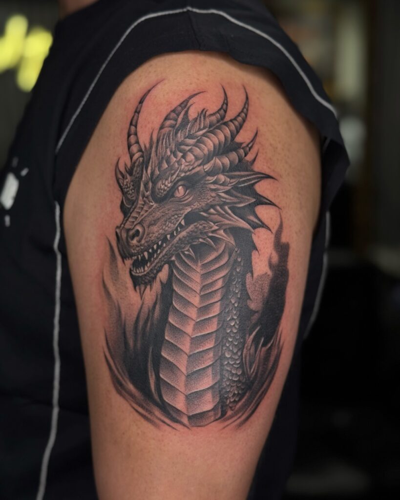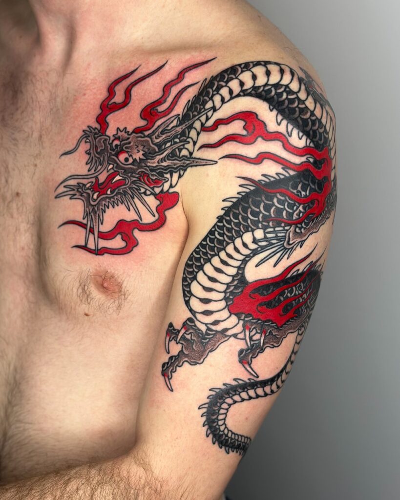 This striking shoulder tattoo features a detailed black dragon with intense red flames curling around its body. The dramatic shading and fine line work emphasize the creature’s scales and ferocious face, giving it a sense of raw energy and dominance.