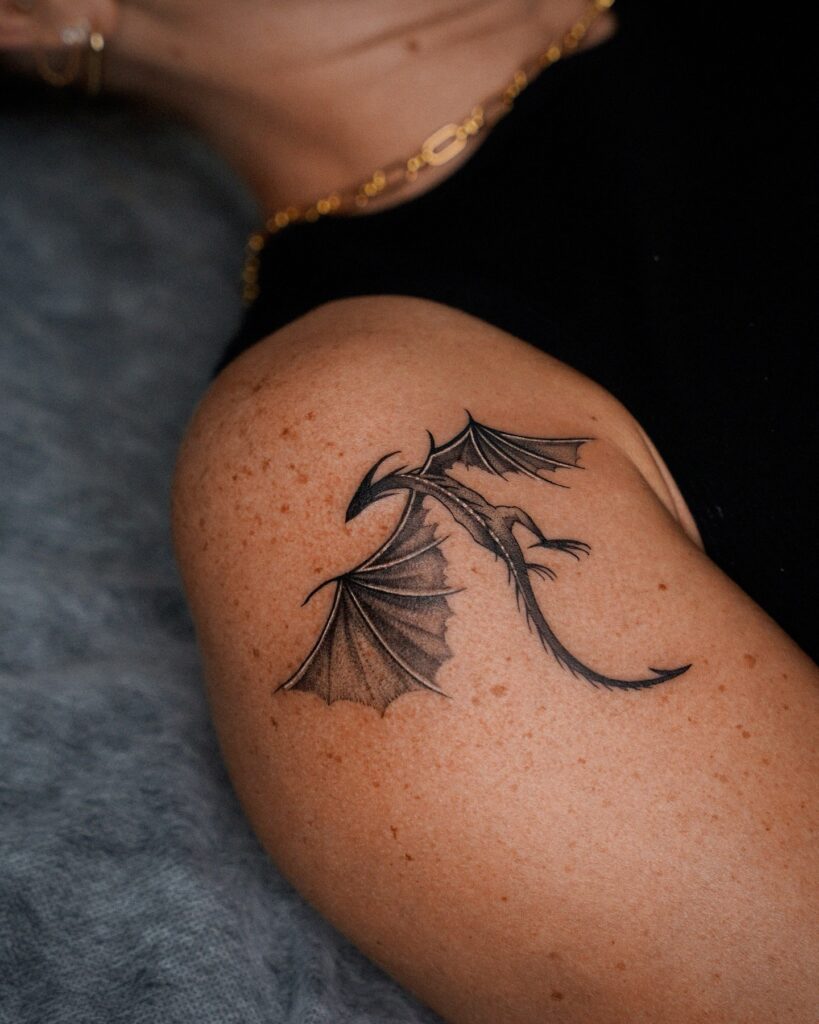 This elegant tattoo features a small, winged dragon delicately perched on the upper shoulder. Rendered in fine black and grey shading, it captures the creature mid-flight with wings spread, tail curling gracefully. Its compact size makes it perfect for subtle yet symbolic expression.