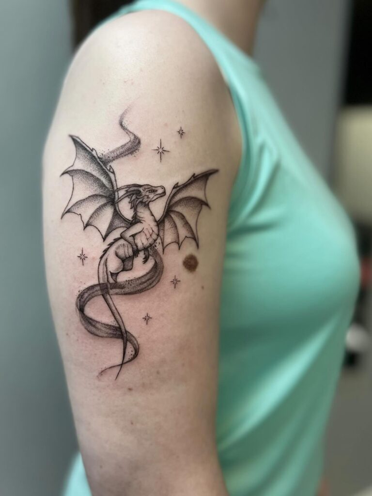 This detailed dragon tattoo showcases a majestic winged creature floating among stars and swirling smoke. The fine black and grey shading creates a sense of lightness, as if the dragon is flying in a mystical night sky. Positioned on the upper arm, it merges fantasy illustration with tattoo artistry, symbolizing freedom, imagination, and celestial power.