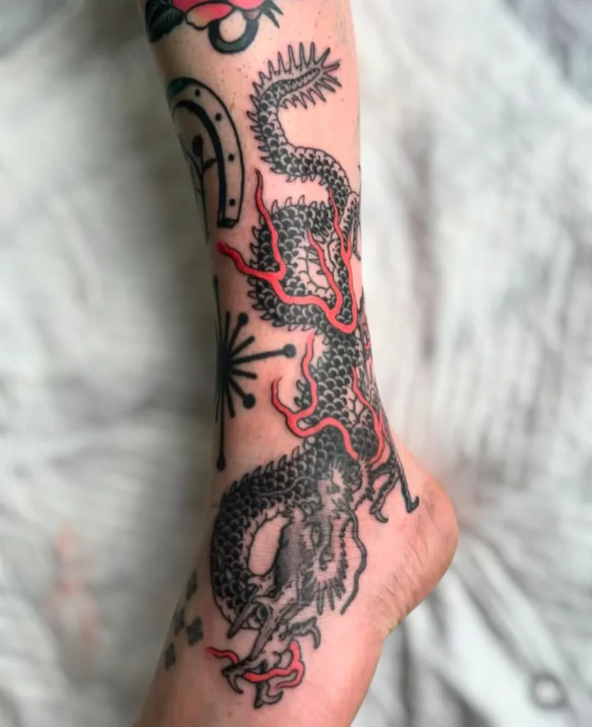 This ankle tattoo depicts a fierce dragon coiling downward, with black scales accented by fiery red flames. The compact design wraps neatly around the lower leg, giving it movement and flow that complements the natural curves of the ankle. The contrasting colors add energy and intensity, making it visually striking despite its smaller placement.