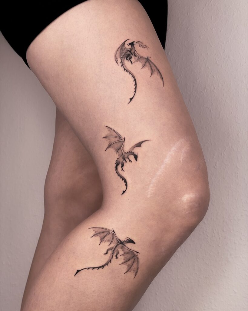 This tattoo design features three elegant dragons soaring across the thigh, each positioned in dynamic mid-flight. The fine black linework and delicate shading highlight their wings and tails, creating movement and harmony as if they are dancing through the sky.