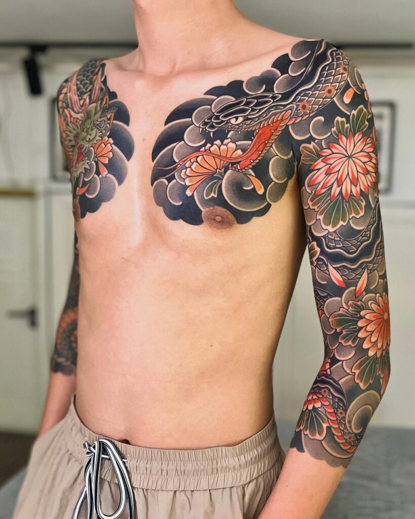 This full chest and arm piece is an elaborate dragon tattoo woven seamlessly into Japanese-inspired floral patterns. The bold black shading and vibrant red and orange accents create a harmonious contrast, blending the dragon with peonies and swirling cloud motifs.