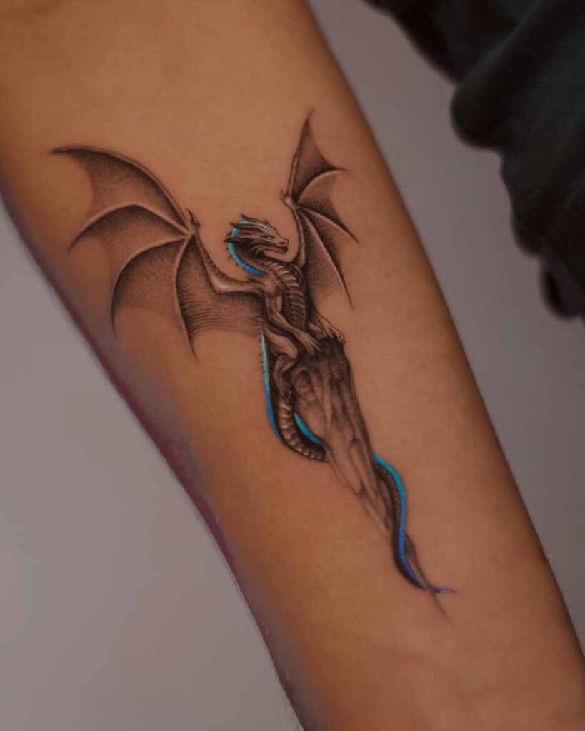 This dragon tattoo blends black-and-grey realism with electric blue highlights along the spine and tail. The contrast adds a futuristic edge while maintaining traditional dragon anatomy and shading.
