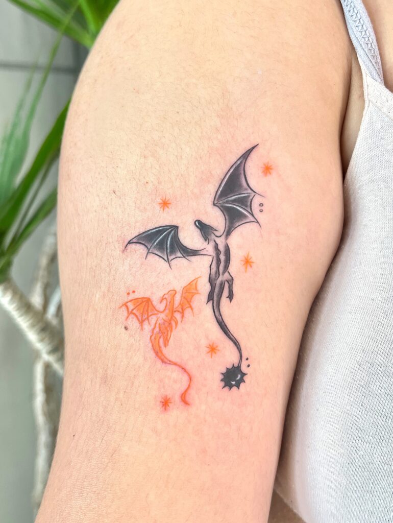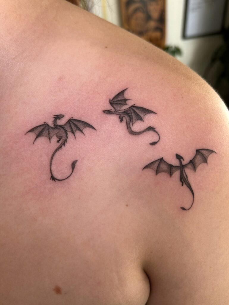 This tattoo features three small dragons flying across the shoulder, each in a slightly different pose. The repetition creates motion and storytelling while keeping the design light and playful.