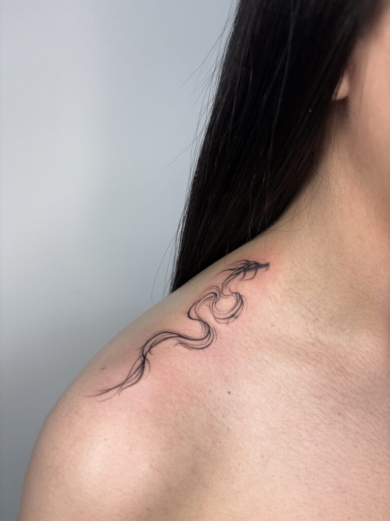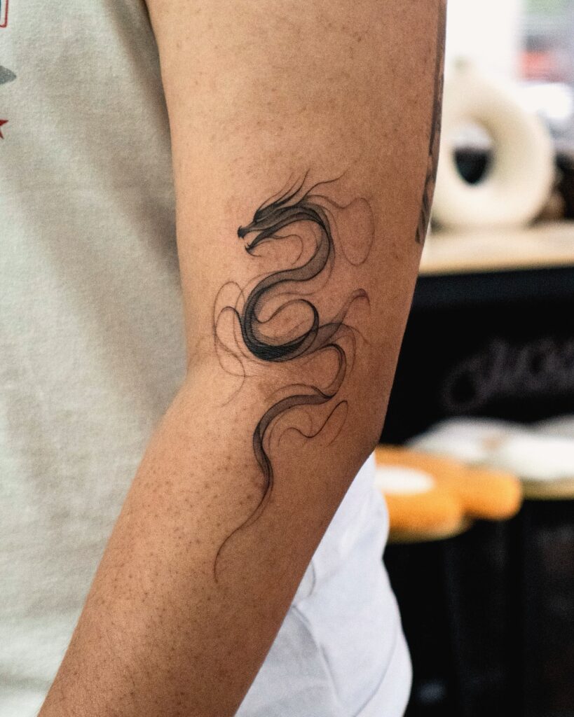 This dragon is formed using wispy, smoke-like lines that trail behind the body, giving the illusion of movement and energy. The minimal shading keeps the design airy and artistic.