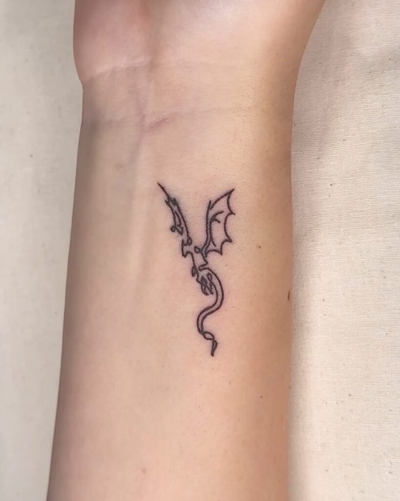 3. Minimal Fine-Line Dragon Wrist Tattoo