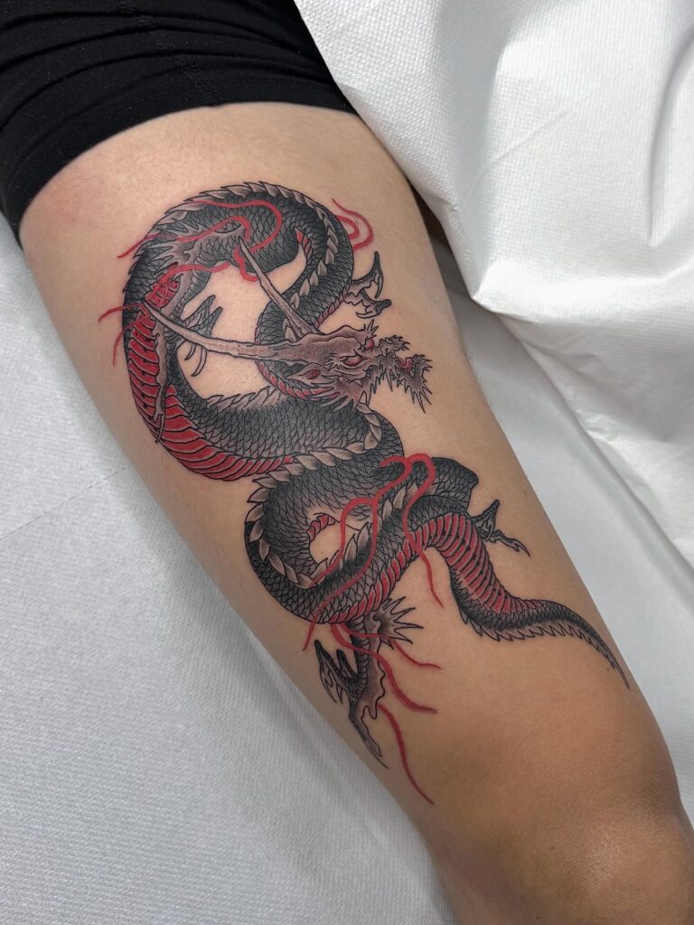 This forearm tattoo features a coiled Asian-style dragon rendered in black ink with striking red accents. The flowing body, whiskered face, and clawed limbs follow traditional Eastern design principles, giving the piece cultural depth and visual rhythm.