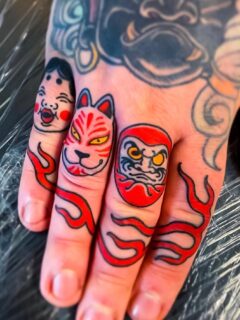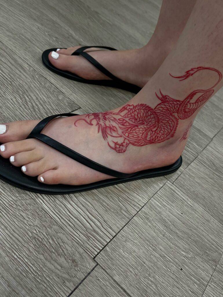 Dragons symbolize power, protection, and wisdom. Rendered in red ink, this tattoo feels bold yet artistic. It’s ideal for someone seeking a statement ankle tattoo rooted in strength and mythological symbolism.