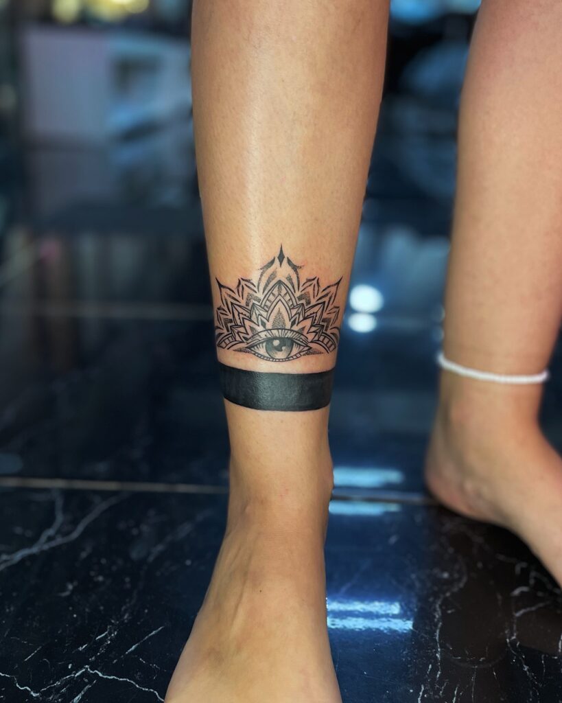 This bold ankle tattoo combines a mandala-inspired pattern with a central eye motif, anchored by a solid black band. The contrast between geometric detail and the thick band creates a powerful visual statement.