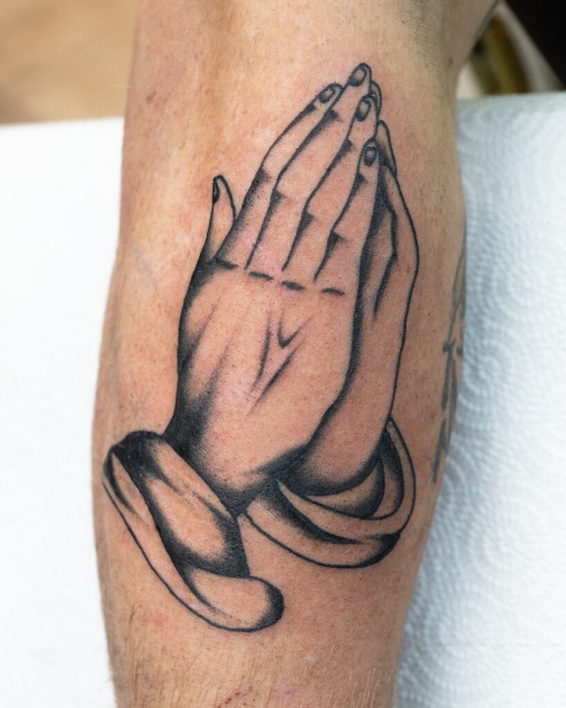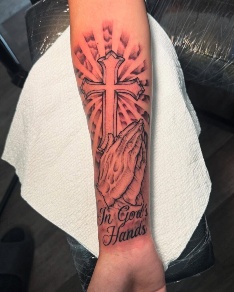 2. Praying Hands and Cross Forearm Tattoo