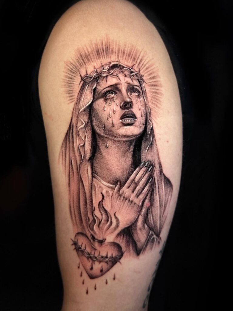 This realistic tattoo portrays the Virgin Mary with a crown of thorns, tears streaming down her face, and a glowing halo above. Fine dotwork and smooth shading create emotional depth, while the sacred heart below reinforces the theme of divine love and sacrifice.