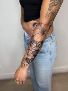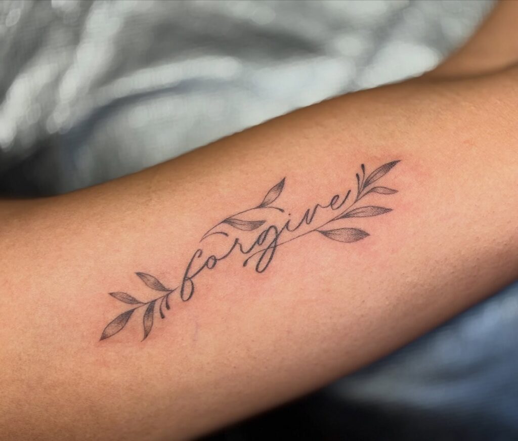 This delicate forearm tattoo features the word “forgive” written in elegant script, framed by subtle leafy branches. The fine-line approach keeps the design soft, clean, and deeply personal, perfect for a minimalist aesthetic.