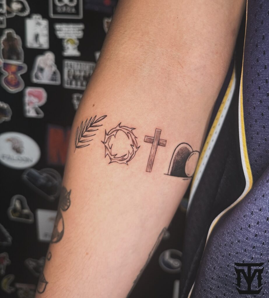 Together, these symbols tell the story of Jesus’ journey—triumph, sacrifice, death, and resurrection. This tattoo is ideal for someone who appreciates subtle storytelling through symbolism and wants a refined Christian design with profound spiritual meaning.