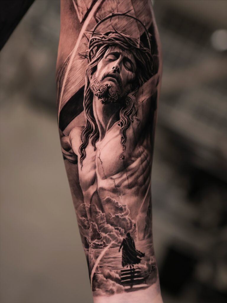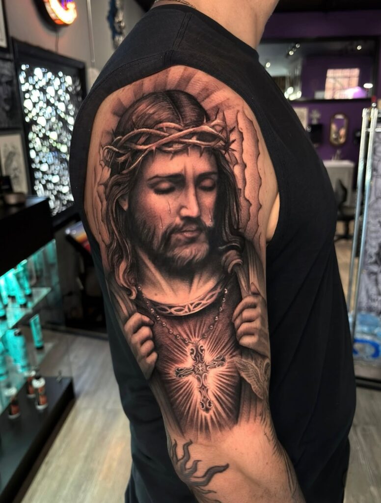 The design symbolizes sacrifice, reflection, and divine love. Combining portraiture with symbolism, this tattoo reflects deep devotion and introspection. It’s an excellent choice for someone seeking a visually striking yet spiritually grounded Christian tattoo.