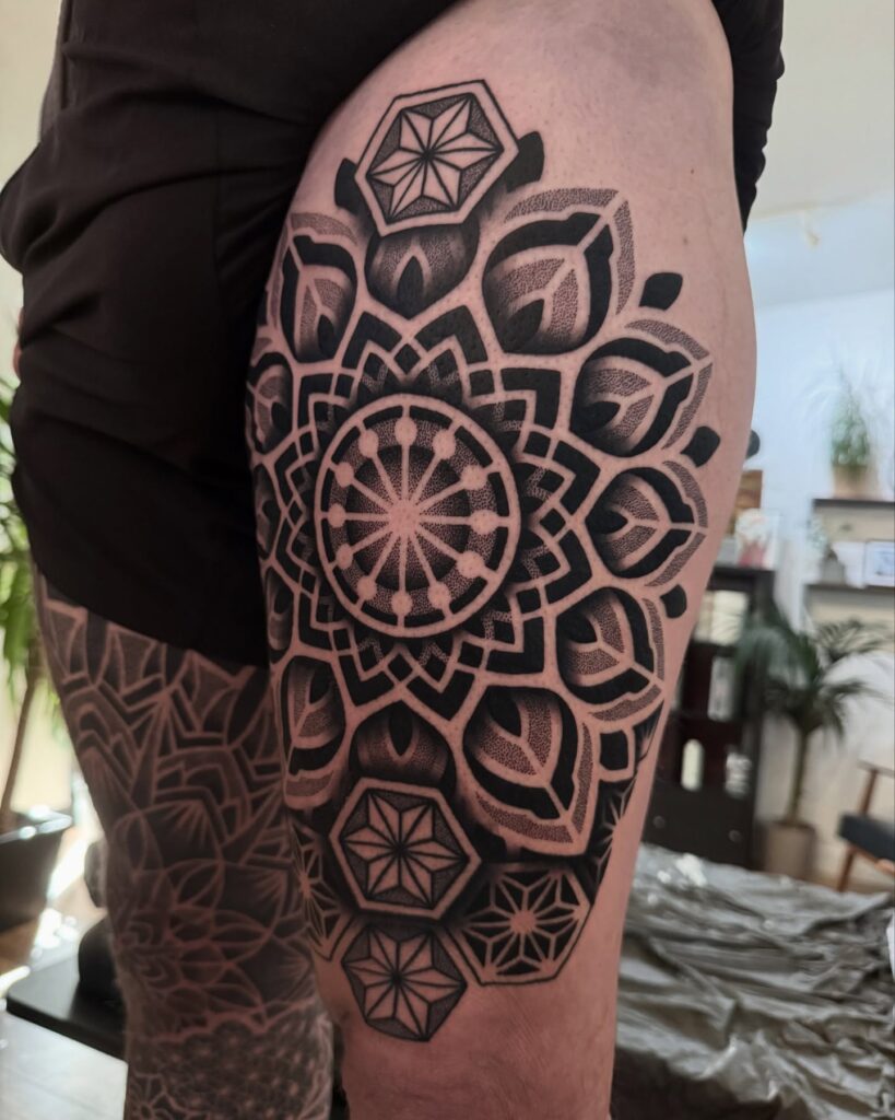 This bold geometric mandala thigh tattoo centers on symmetry, precision, and balance. Thick black outlines frame layered petal shapes, while dotwork shading adds depth and softness without overwhelming the structure. The repeating geometry creates a hypnotic visual flow that naturally complements the curve of the thigh.