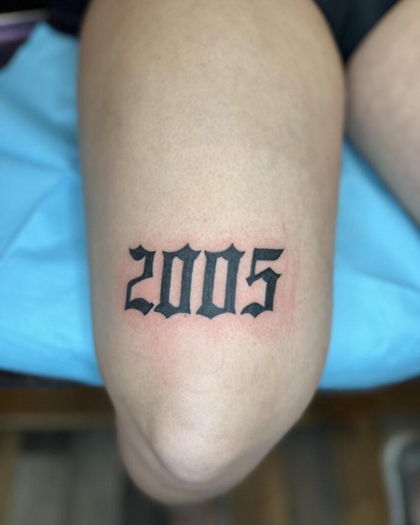 This clean, minimalist thigh tattoo features the year “2005” in bold gothic-style lettering. The sharp edges and solid black fill create a strong visual impact, while the simple design keeps the focus on personal meaning rather than decoration.