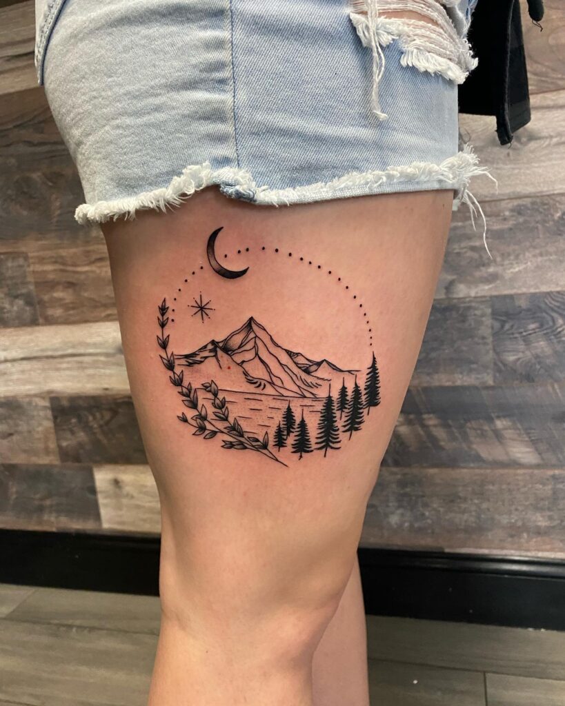 Mountain tattoos often symbolize stability, inner strength, and life’s journey. The thigh placement gives the design room to breathe, allowing its calm energy to shine. This tattoo is perfect for nature lovers who prefer subtle, meaningful artwork with a peaceful, timeless aesthetic.