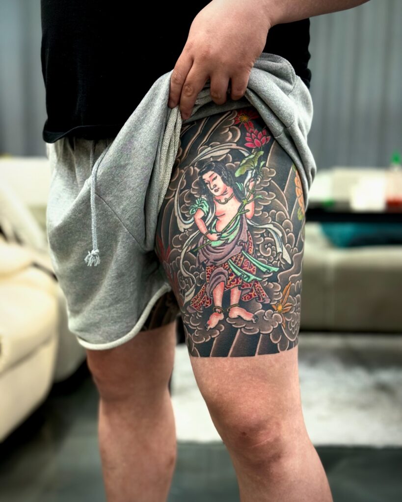 Japanese deity tattoos often represent protection, courage, and spiritual guidance. The thigh offers enough space for detailed storytelling while allowing the artwork to remain balanced and cohesive. This tattoo is perfect for collectors who value cultural depth, tradition, and visually powerful designs.