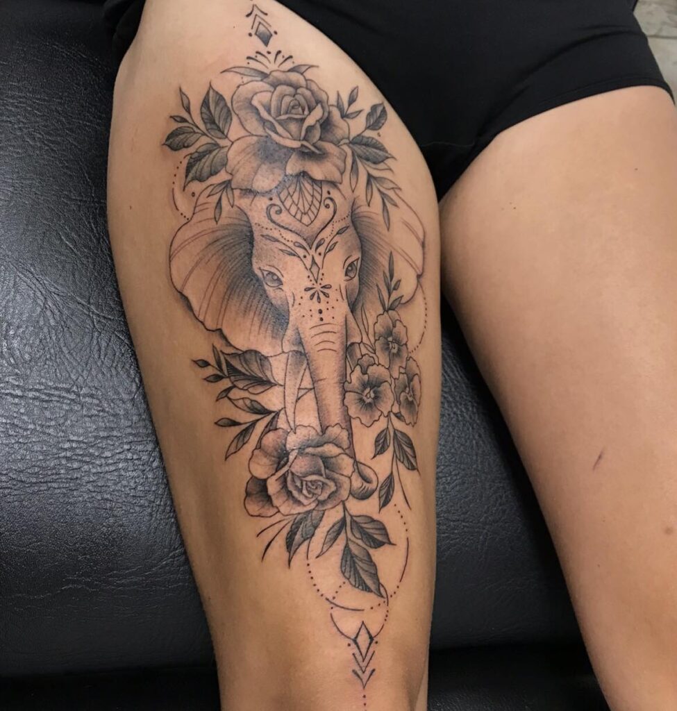 6. Elephant and Floral Thigh Tattoo