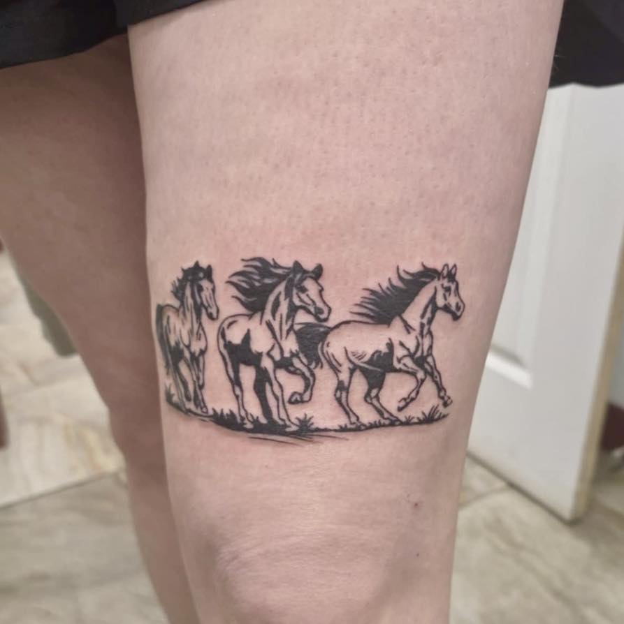 This horizontal thigh tattoo depicts a group of running horses in a continuous band. Clean linework and light shading create motion and unity, capturing the raw energy of freedom and strength. The band-style placement wraps naturally around the thigh, enhancing its dynamic feel.