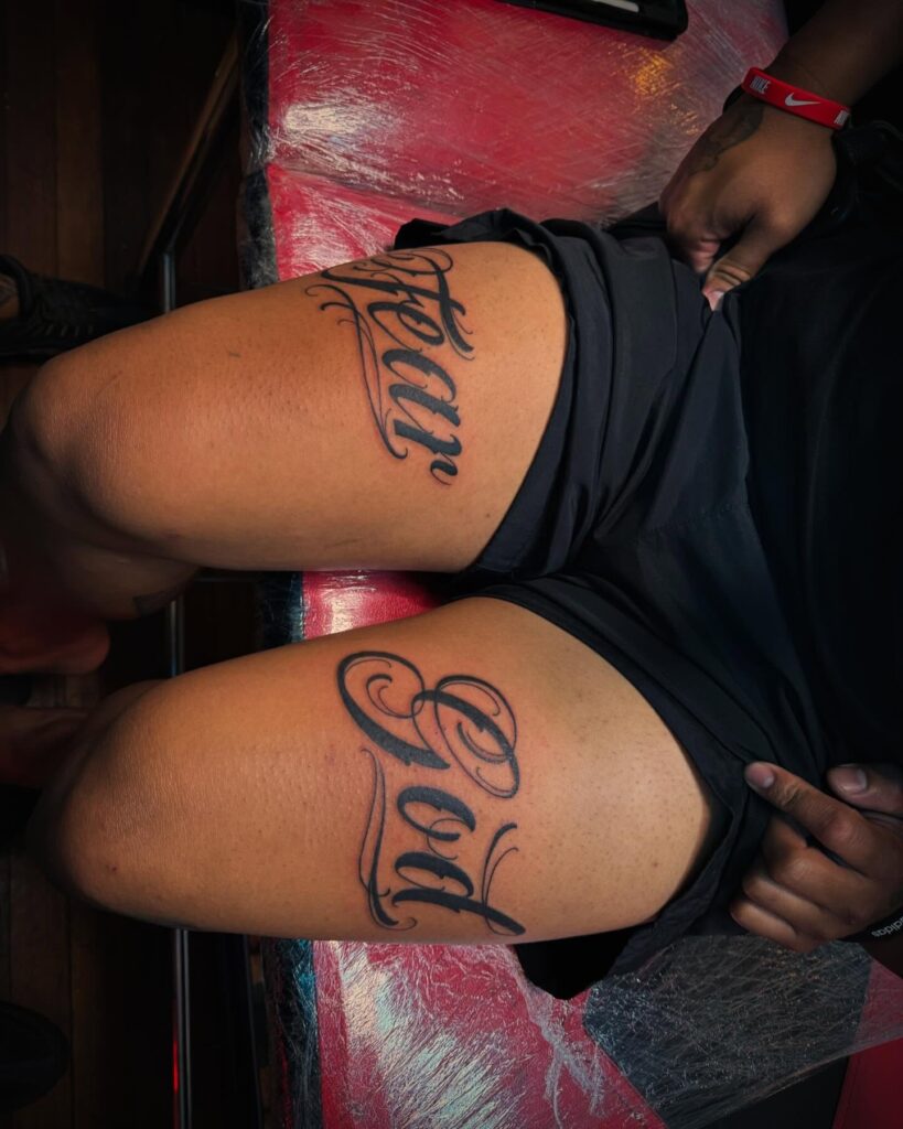 3. Script Name Thigh Tattoos (Matching Pair)