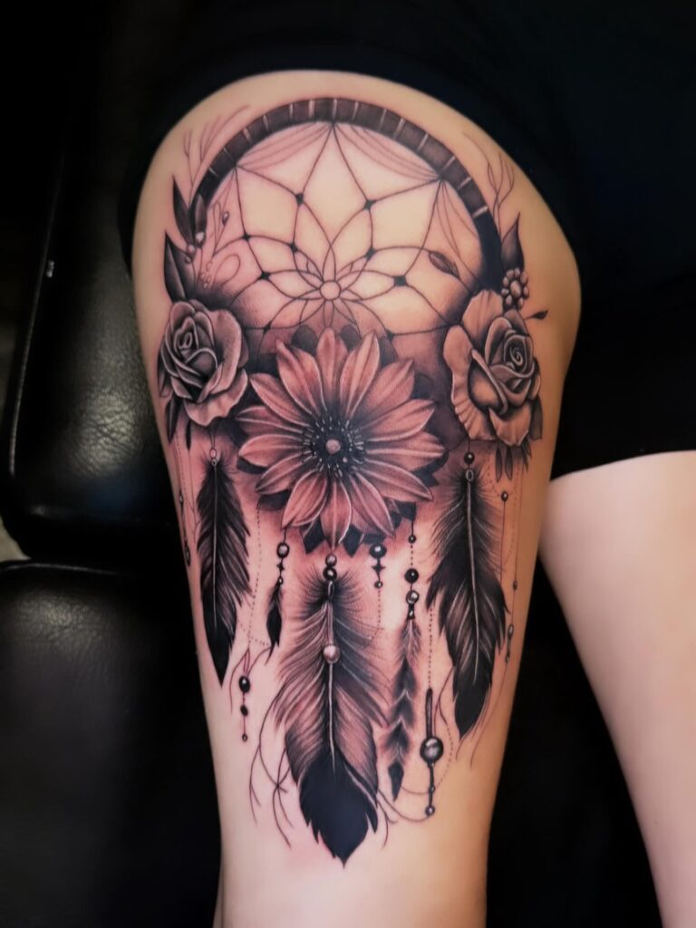 4. Floral Dreamcatcher Thigh Tattoo