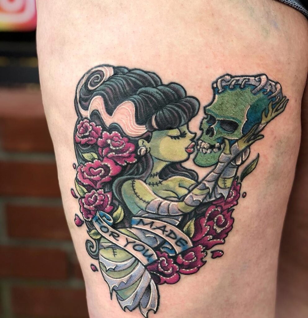 The tattoo depicts the Bride of Frankenstein holding and kissing a green skull, which presumably represents Frankenstein’s monster. The artwork is accented with several pink roses surrounding the figures, adding a touch of color and contrast. A banner is incorporated into the lower part of the design, which contains the text “MADE FOR YOU”. The overall aesthetic uses bold lines and rich colors typical of new school or traditional tattoo styles.