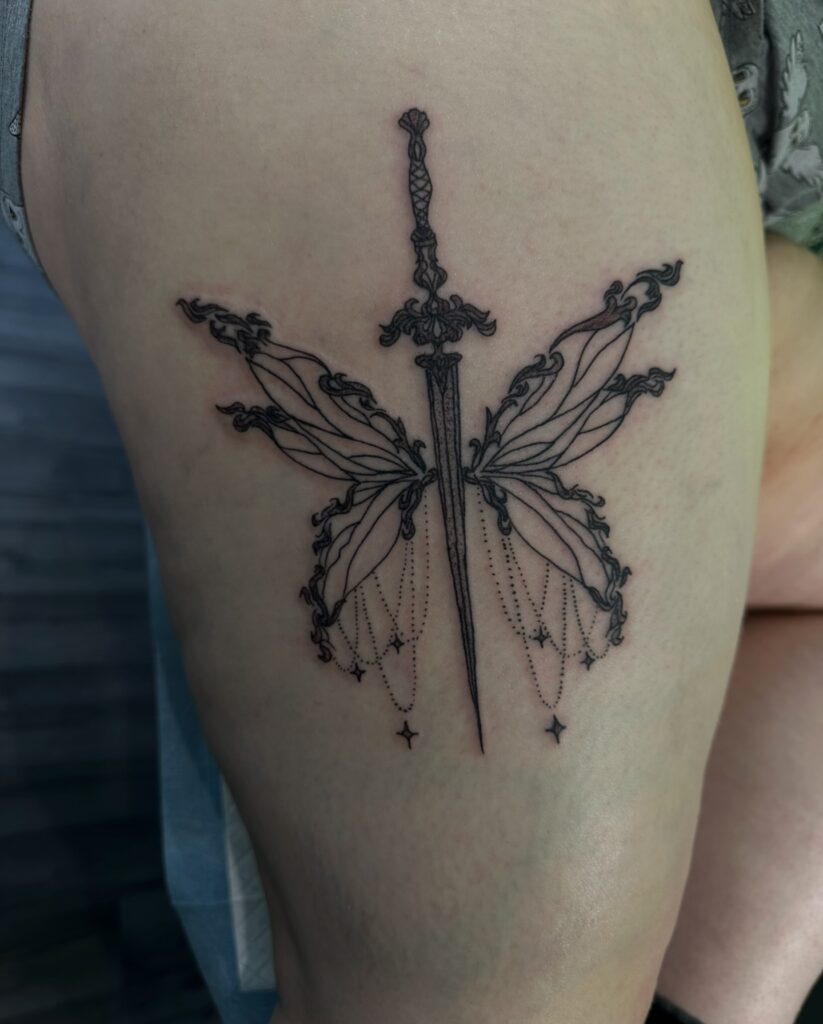 This striking thigh tattoo merges a vertical sword with delicate butterfly wings, creating a contrast between strength and fragility. Fine lines, ornamental details, and dangling dotwork give the piece a mystical, ethereal quality.