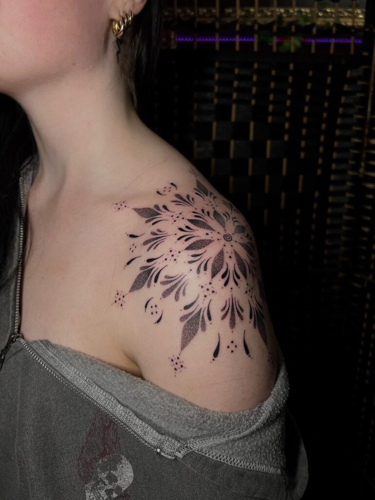 This shoulder tattoo showcases a radial, mandala-inspired floral design created with dotwork and flowing petal shapes. The symmetry radiates outward from a central point, giving the piece a harmonious and meditative quality. Fine dots and negative space keep it visually light.