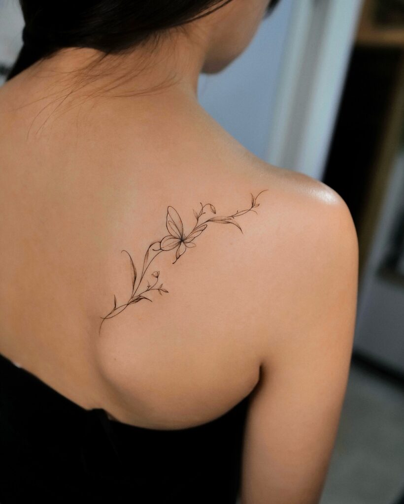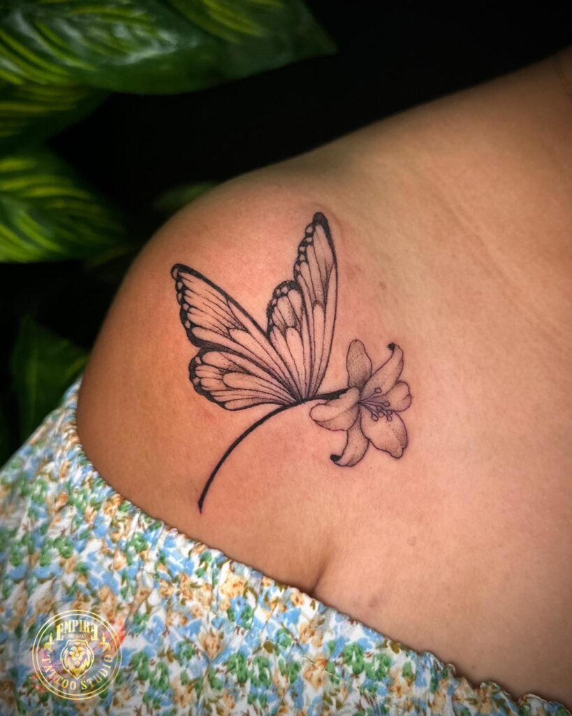 This elegant shoulder tattoo combines a softly shaded butterfly with a delicate flower, creating a sense of lightness and motion. Fine linework defines the wings, while gentle dot shading adds depth without overpowering the skin. The curved stem follows the shoulder’s natural contour, making the design feel organic and graceful.