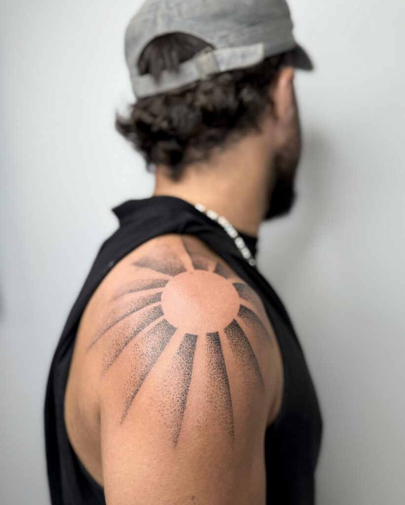 This shoulder tattoo depicts a stylized sun formed with bold shapes and dot shading. The rays extend outward in a balanced pattern, creating a strong visual presence while maintaining a clean, modern aesthetic. The circular center anchors the design.