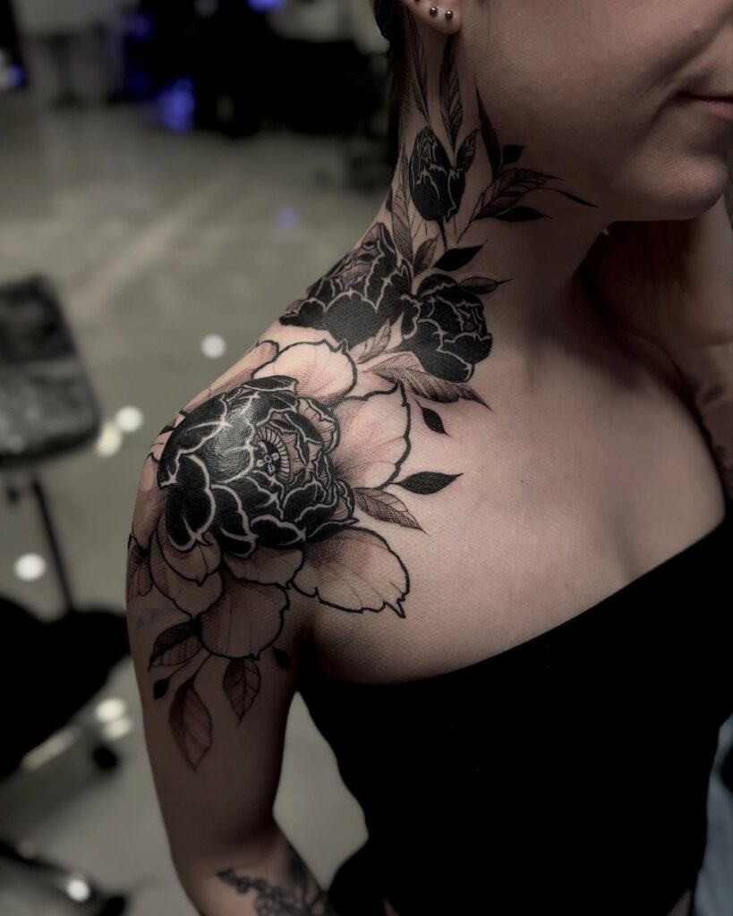 This striking shoulder tattoo features large flowers rendered in bold blackwork and smooth shading. The petals overlap with dramatic contrast, creating depth and a sculptural feel. Extending from the shoulder toward the neck, the composition accentuates the body’s natural lines.