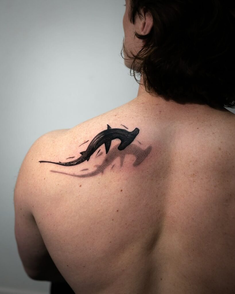 10. Dynamic Blackwork Dolphin Shoulder Tattoo